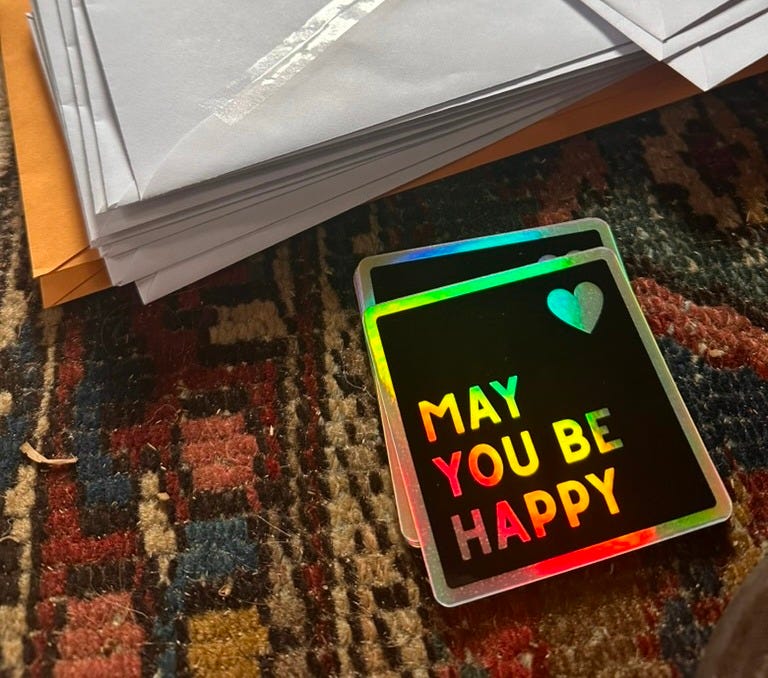 I've been enjoying mailing out MAY YOU BE HAPPY stickers (origin story). It's a bit of spiritual activism, born from the sense that maybe what the world needs is a little more love and well-wishing for our fellow human, no matter their views.